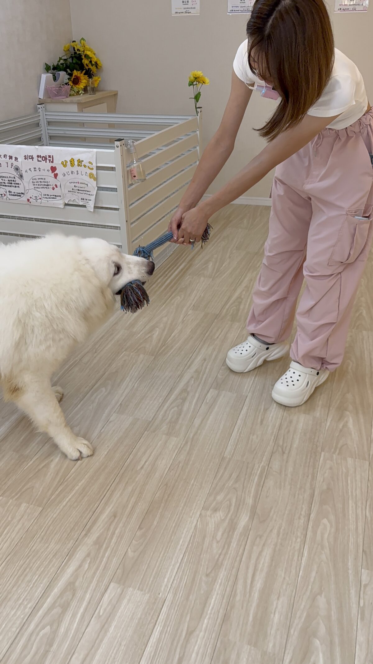 ふれあいルームで遊んでいると良くロープの引っ張り合いが始まります!蓮くんは引っ張り合いっこが大好きなんです🤭💭
