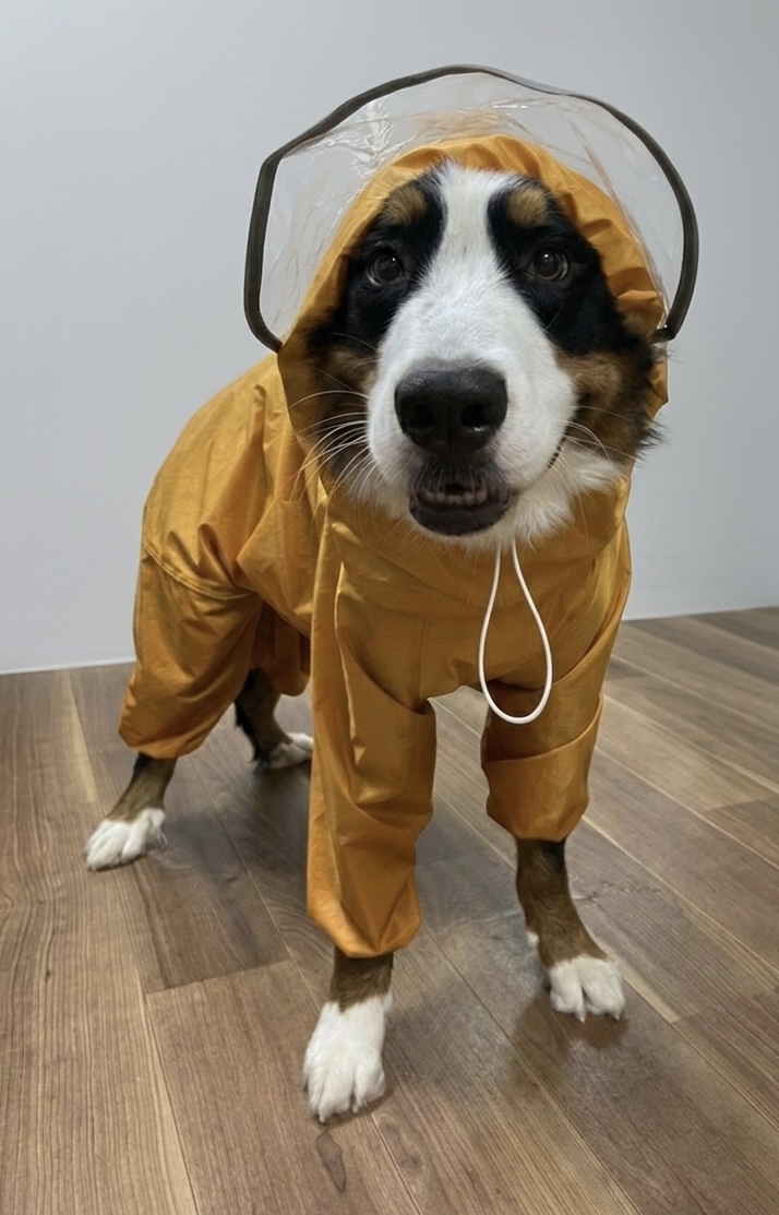 第一次穿雨衣的伯尼山犬枫!